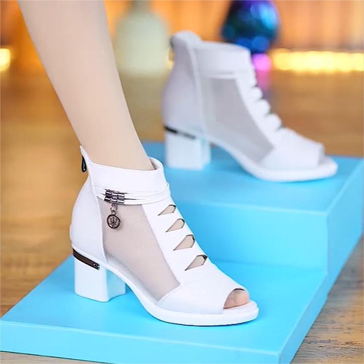 【35-40】2024 Vară stil nou toc gros gura de pește plasă sandale respirabile goale